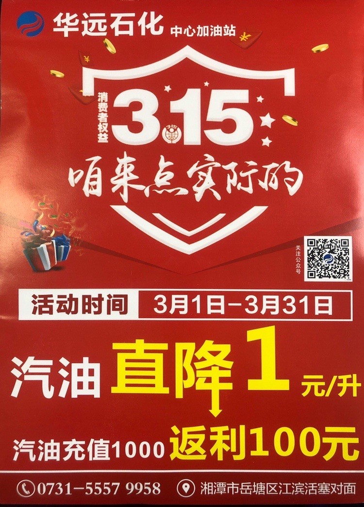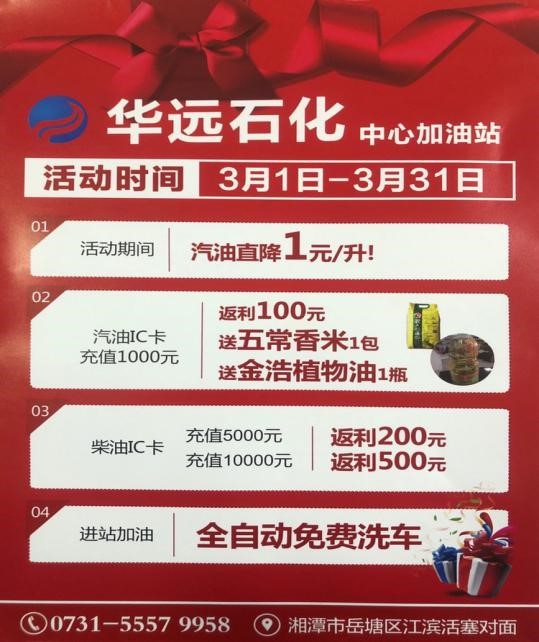 2020年3月疫情得到控制以后,湖南華遠石化有限公司響應政府號召,支持湘潭市各企業(yè)開展復工復產工作,在湘潭市中心加油站率先推出油品單價掛牌價直降1元的優(yōu)惠活動,讓利社會,回報大眾。另外持華遠石化加油卡充值優(yōu)惠返利10%,活動時間3月份,長達一個月,此外充值還贈送東北五常大米,金浩茶油等基本生活物資。