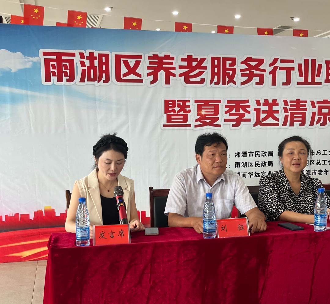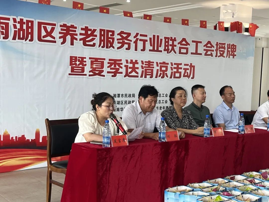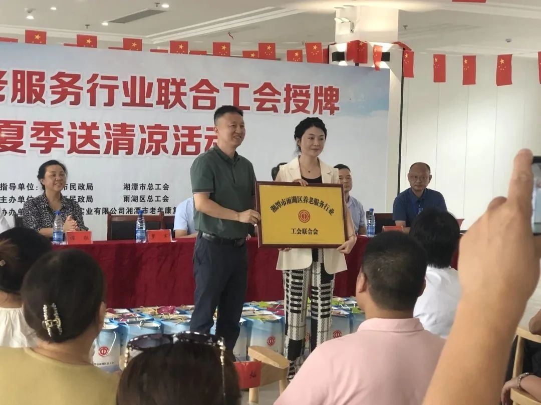 8月23日,雨湖區(qū)養(yǎng)老服務行業(yè)聯(lián)合工會授牌儀式暨夏季送清涼活動在我院舉行。區(qū)總工會黨組書記、常務副主席劉征,人大常委會副主任、區(qū)總工會主席譚聯(lián),市總工會黨組成員、副主席羅軍,湘潭市民政局黨委委員、副局長韓賢海,雨湖區(qū)委副書記蔣文武,市工會組織部部長劉志勇,以及來自雨湖區(qū)各養(yǎng)老機構(gòu)的負責人代表參會,雨湖區(qū)民政局黨組書記、局長干建暉主持會議,華遠康養(yǎng)中心法人譚燦任首屆工會主席。